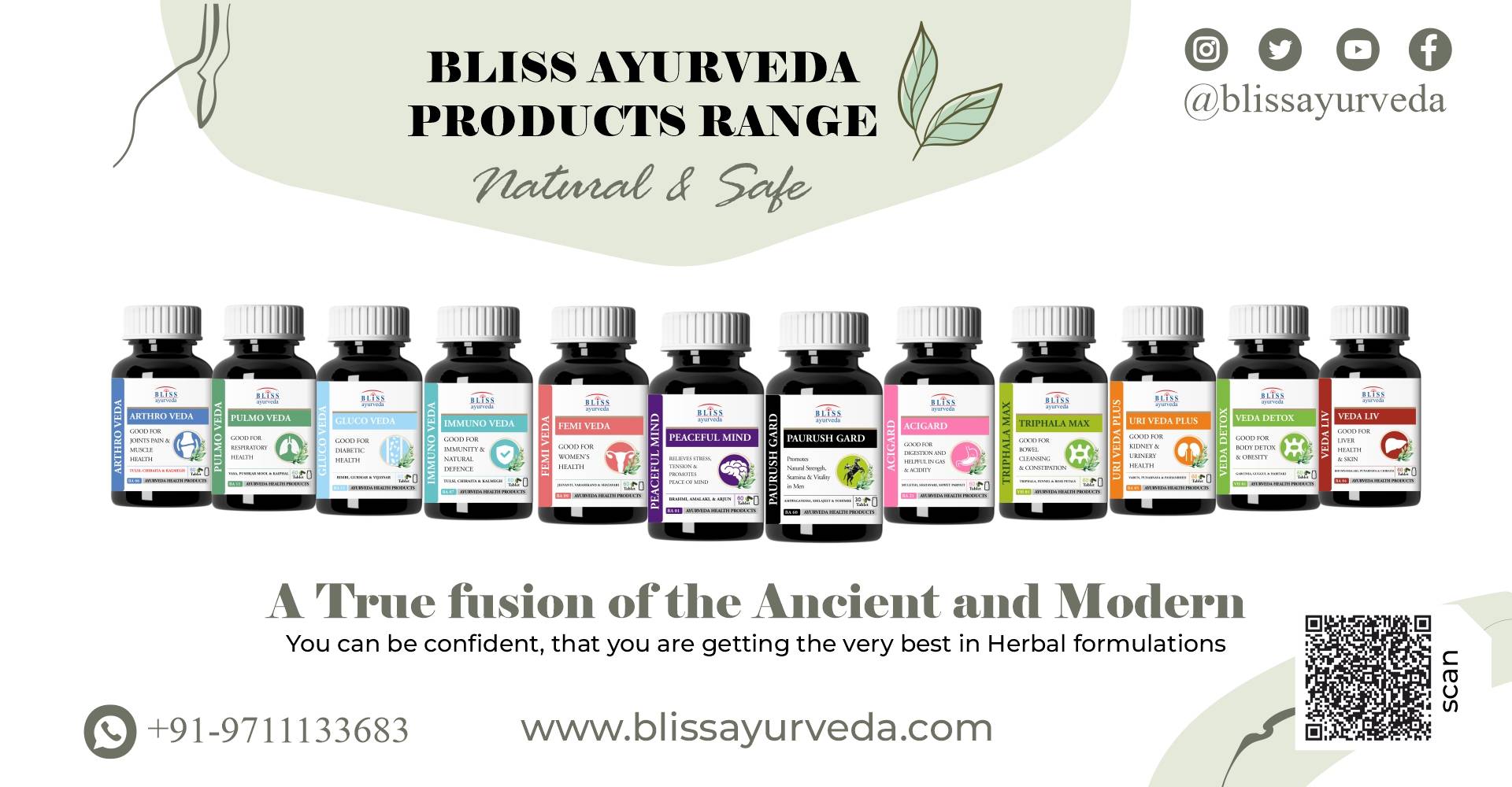 Bliss Ayurveda has a wide range of products who take care of whole aspect of Health. We have Herbal Tablets, Herbal Oil, Herbal Syrup, Herbal Paste, Herbal Candy, Softgel, Herbal Face Pack etc. For more details you can visit at www.blissayurveda.com.